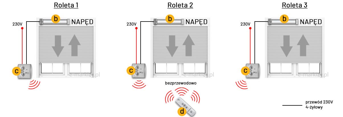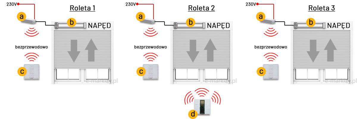 Takie podłączenie stosujemy analogicznie do pozostałych rolet/żaluzji. Dodatkowo, centralnie, instalujemy pilota zbiorczego (d) (który zazwyczaj obsługuje do 15 odbiorników). Przy tak wykonanej instalacji, możemy sterować silnikami rolet/żaluzji indywidualnie za pomocą pilota (c) oraz grupowo (wszystkie jednocześnie) za pomocą pilota zbiorczego (d). Pilotem zbiorczym (d) sterujemy zarówno wszystkimi silnikami jak i mamy możliwość sterowanie poszczególnymi roletami/żaluzjami.