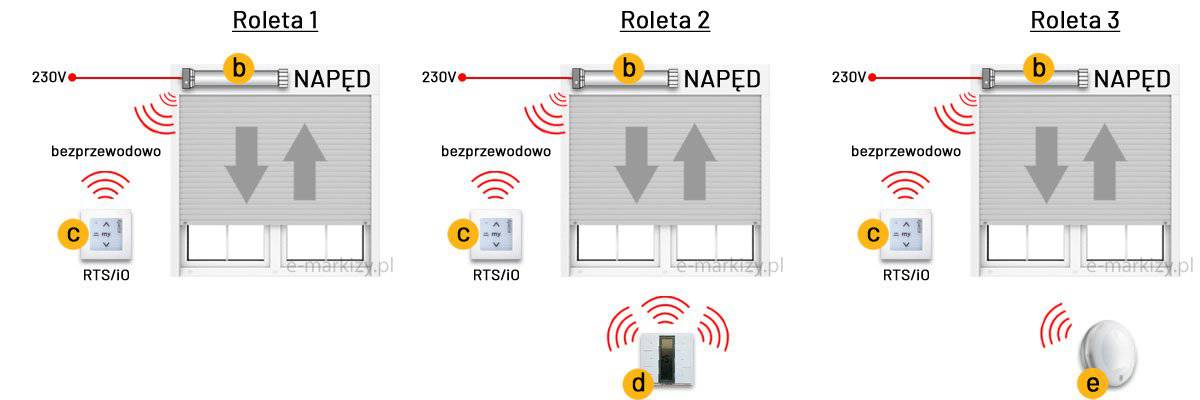 Ten rodzaj systemu jest analogiczny jak do punktu 1a. Główną różnicą jest zastosowanie silników z wbudowaną centralką. W punkcie 1a centralka (a) jest osobnym elementem (jest małych rozmiarów i z łatwością możną ją ukryć np. w skrzynce rolety). Centralki sterujące mogą być również wbudowane w silnik (są niewidoczne) – jak w tym przykładzie. W tym wypadku z silnika (b) wyprowadzony jest przewód (około 2m), który podłączamy bezpośrednio do zasilania 230V. Silnik z centralką łączy się bezprzewodowo z pilotem/przełącznikiem (c), może być również automatycznie sterowany czujnikiem (e). Podobnie jak w punkcie 1a, napędami możemy sterować oddzielnie za pomocą pilotów (c) lub grupowo pilotem (d). Dodatkowo, do całej instalacji można zastosować dowolne czujniki bezprzewodowe (e) (np. słońca), które komunikują się bezprzewodowo z napędami rolet/żaluzji.