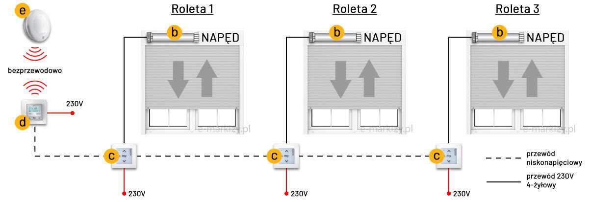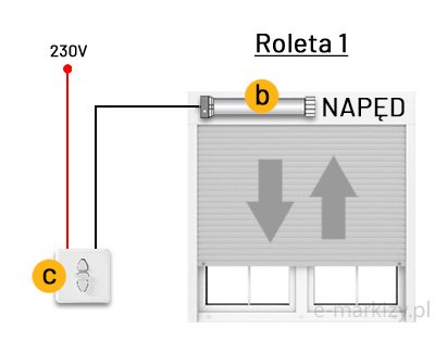 Ten system różni się głównie od systemów bezprzewodowych 1a i 1b koniecznością połączenia silnika rolety/żaluzji (b) z przełącznikiem (c). Cała instalacja opiera się na łączeniu przewodowym. Do przełącznika (c) doprowadzamy przewód z napięciem 230V oraz przewód od silnika rolety/żaluzji.