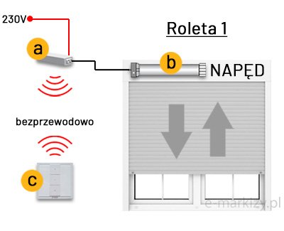 Jest to najbardziej popularny system do sterowania silnikiem rolety/żaluzji. Instalacja sprowadza się do podłączenia centralki sterującej (a) do silnika rolety (b). Następnie do centralki (a) doprowadzamy zasilanie 230V. Centralka (a) łączy się bezprzewodowo z pilotem (c). Pilot może być w formie przełącznika i może być przymocowany na stałe do ściany.