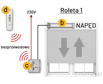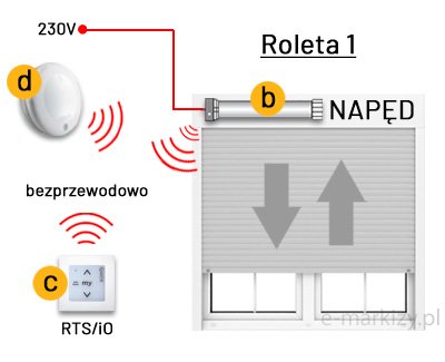Ten rodzaj systemu jest analogiczny jak do punktu 1a. Główną różnicą jest zastosowanie silnika z wbudowaną centralką. W punkcie 1a centralka (a) jest osobnym elementem (jest małych rozmiarów i z łatwością możną ją ukryć np. w skrzynce rolety). Centralki sterujące mogą być również wbudowane w silnik (są niewidoczne) – jak w tym przykładzie. W tym wypadku z silnika (b) wyprowadzony jest przewód (około 2m), który podłączamy bezpośrednio do zasilania 230V. Silnik z centralką łączy się bezprzewodowo z pilotem/przełącznikiem (c), może być również automatycznie sterowany czujnikiem (d).