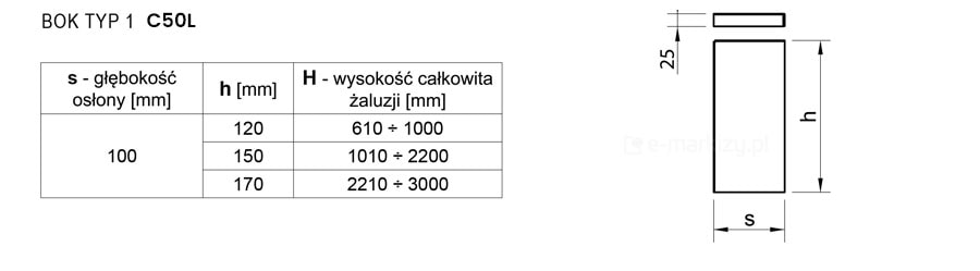 Strona dotyczy żaluzji C50L firmy Selt wykonywanej na wymiar. Blacha osłonowa nie jest opcją wymaganą — możliwy jest montaż żaluzji bez blach osłonowych (do sufitu lub do ściany/sufitu przy użyciu uchwytów głównych).