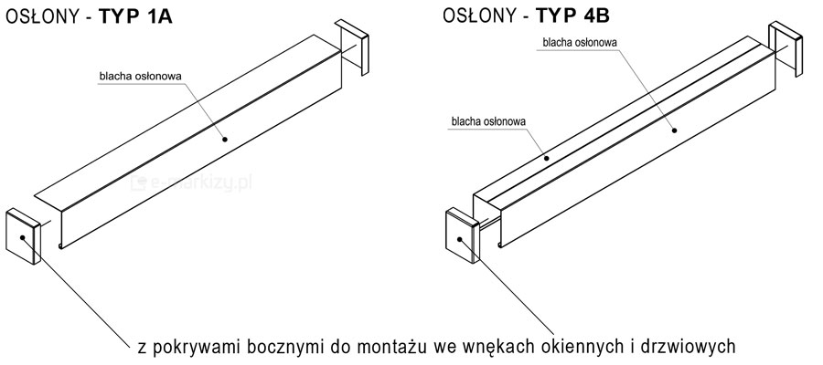 Blacha typ 4B to blacha osłaniająca przód, tył i górę żaluzji, stosowana najczęściej przy montażu żaluzji na fasadzie. Zaślepki boczne występują jako opcja za dodatkową opłatą i stosowane są w celu uzyskania pełnej osłony pakietu lamel.