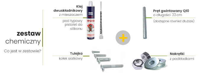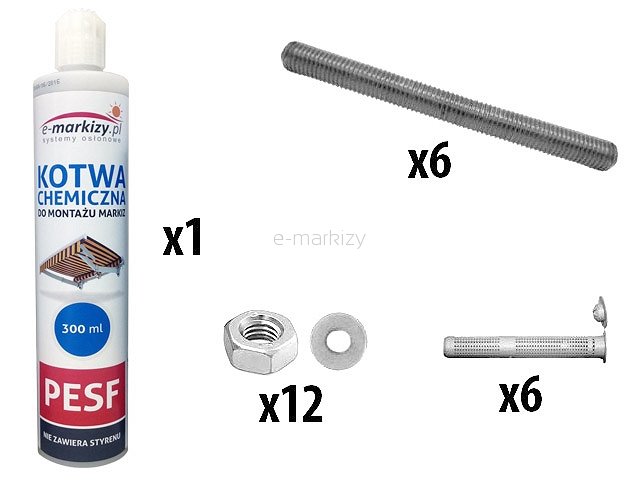 Zestaw składa się z: 1 szt klej z mieszaczem, 6 szt prętów, 12 szt nakrętek, 12 szt podkładek, 6 szt tulejek siatkowych.