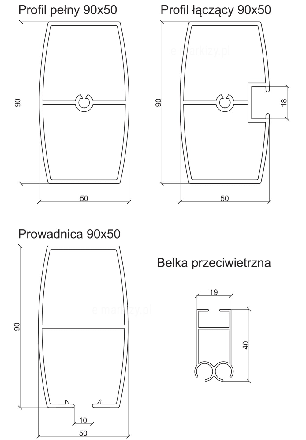 Dach Pergoli Silva – Pomiar i Dane Techniczne - Pergola międzyścienna na prowadnicach, 2 prowadnice tkaniny, dach pergolowy prowadnice, Pergole dachowe profile przekroje, profil pełny pergoli, profil łączący pergoli, prowadnica pergoli, belka przeciwietrzna, Dach międzyścienny, pakiet tkaniny pergoli, Pergola supro plus rozstaw prowadnic dane techniczne