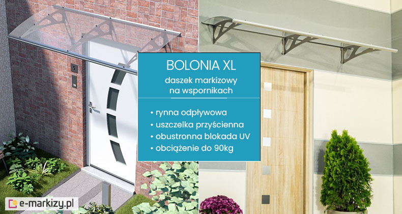 Daszek Bolonia XL ma kształt markizy. Konstrukcja wykonana ze stali nierdzewnej występuje wyłącznie w kolorze szarym. Wypełnienie standardowo stanowi płyta akrylowa przejrzysta. Za dopłatą możliwe jest wykonanie wypełnienia z płyty akrylowej satynowanej. Wypełnienie zapewnia obustronną ochronę przed promieniowaniem UV. Daszek Bolonia XL wytrzymuje obciążenie do 90 kg.