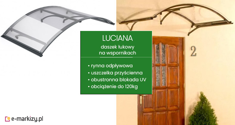 Daszek Luciana to nowoczesny łukowy daszek mocowany na wspornikach. Konstrukcja z aluminium malowanego proszkowo występuje w czterech kolorach do wyboru: białym, srebrnym, brązowym oraz antracytowym. Wypełnienie natomiast standardowo jest przejrzyste. Zastosowana w wypełnieniu płyta akrylowa PMMA zapewnia obustronną blokadę promieni UV. Daszek Luciana wytrzymuje obciążenie do 120 kg.
