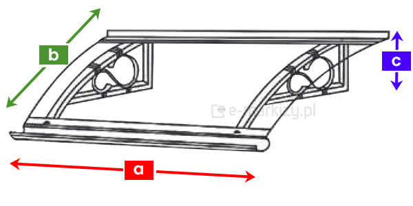 Pomiaru daszku dokonuje się na podstawie przedstawionego rysunku, gdzie litery na obrazku odpowiadają odpowiednio wymiarom podanym w przedstawionej ofercie: