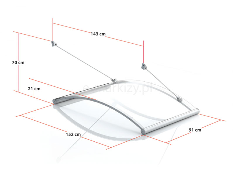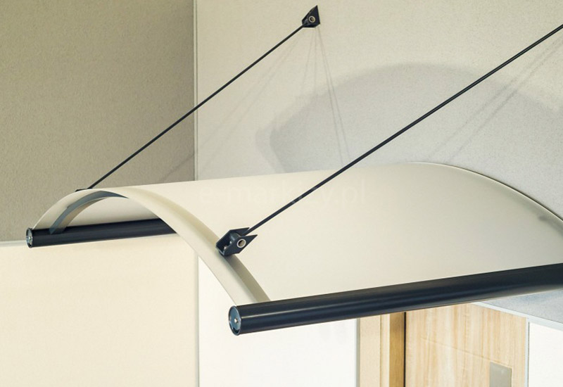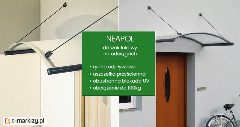Daszek Neapol to nowoczesny daszek łukowy na odciągach. Konstrukcja z aluminium malowanego proszkowo występuje w trzech kolorach do wyboru: białym, srebrnym oraz antracytowym. Wypełnienie płytą akrylową PMMA może być przejrzyste lub satynowane (dodatkowa opłata). Zastosowana w wypełnieniu płyta akrylowa PMMA zapewnia obustronną blokadę promieni UV. Daszek Neapol wytrzymuje obciążenie do 100 kg.
