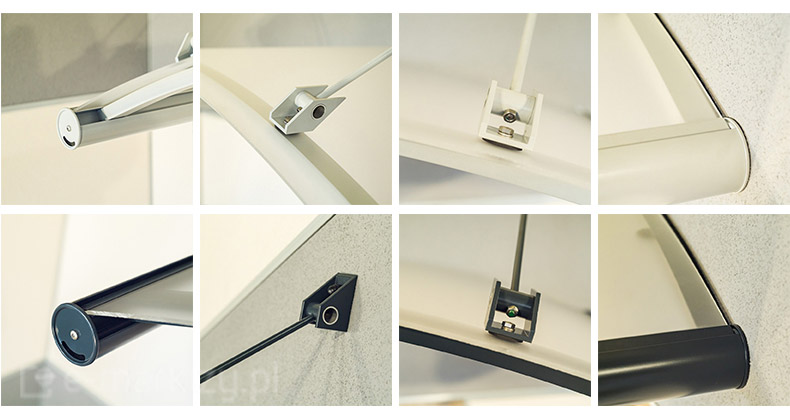 Montaż oferowanych przez nas daszków jest niezwykle prosty. Wystarczy nawiercić w ścianie otwory, w miejscach w których znajdują się uchwyty i dokręcić daszek do ściany. Każdy daszek posiada instrukcję jego zamontowania dołączoną do produktu.