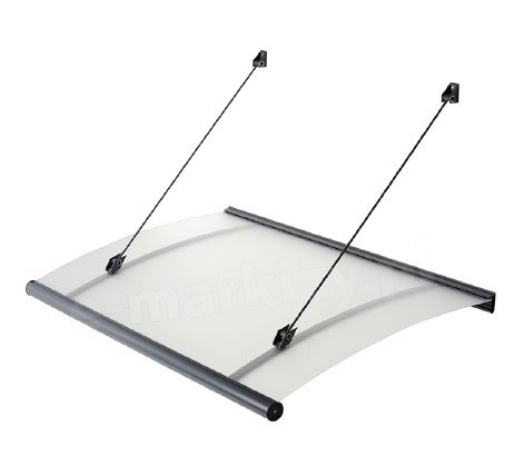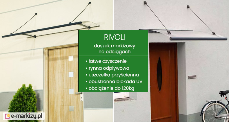 Daszek Rivoli to nowoczesny daszek w kształcie markizy na odciągach. Konstrukcja z aluminium malowanego proszkowo występuje w trzech kolorach do wyboru: białym, srebrnym oraz antracytowym. Wypełnienie płytą akrylową PMMA może być przejrzyste lub satynowane (dodatkowa opłata). Zastosowana w wypełnieniu płyta akrylowa PMMA zapewnia obustronną blokadę promieni UV. Daszek Rivoli wytrzymuje obciążenie do 120 kg.
