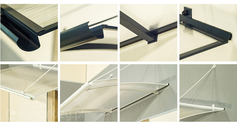 Montaż oferowanych przez nas daszków jest niezwykle prosty. Wystarczy nawiercić w ścianie otwory, w miejscach w których znajdują się uchwyty i dokręcić daszek do ściany. Każdy daszek posiada instrukcję jego zamontowania dołączoną do produktu.