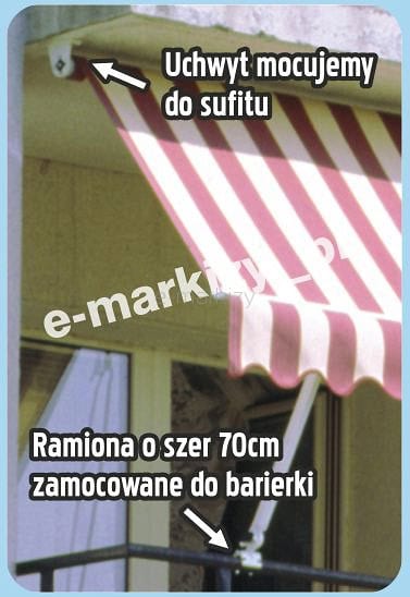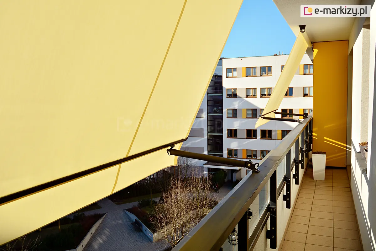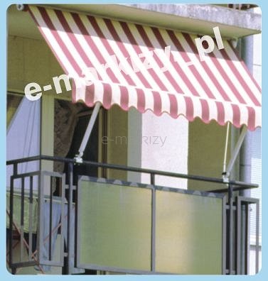 Markiza balkonowa z ramionami poręczowym to estetyczna osłona przed słońcem. Jest to praktyczna ozdoba balkonów, tarasów i wnęk balkonowych. Zastosowanie ramion balustradowych daje większą swobodę montażu na balkonach. Elementy konstrukcyjne lakierowane są techniką proszkową na kilka standardowych kolorów.