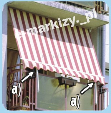 Markiza balkonowo-poręczowa z ramionami poręczowymi montowana jest na dwóch uchwytach, skrajnie po obu końcach markizy. Konstrukcja markizy balkonowo-poręczowej z ramionami poręczowym charakteryzuje się uniwersalnymi uchwytami będącymi jednocześnie uchwytemi ścienno-sufitowymi. Ramiona markizy pozwalają na montaż do balustrady w większości standardowych balkonów. To doskonałe a zarazem bardzo praktyczne rozwiązanie.