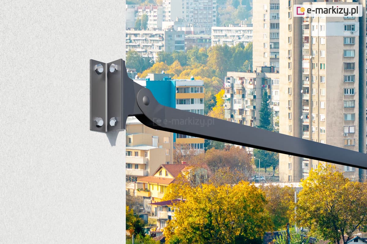 Markizę italia posiada uniwersalne uchwyty ścienno – sufitowe, dzięki temu możemy zamocować ją zarówno do ściany jak i sufitu. Najbardziej popularnym sposobem zamontowania to montaż ścienny. Ramiona natomiast przykręcamy najczęściej do ściany lub wnęki