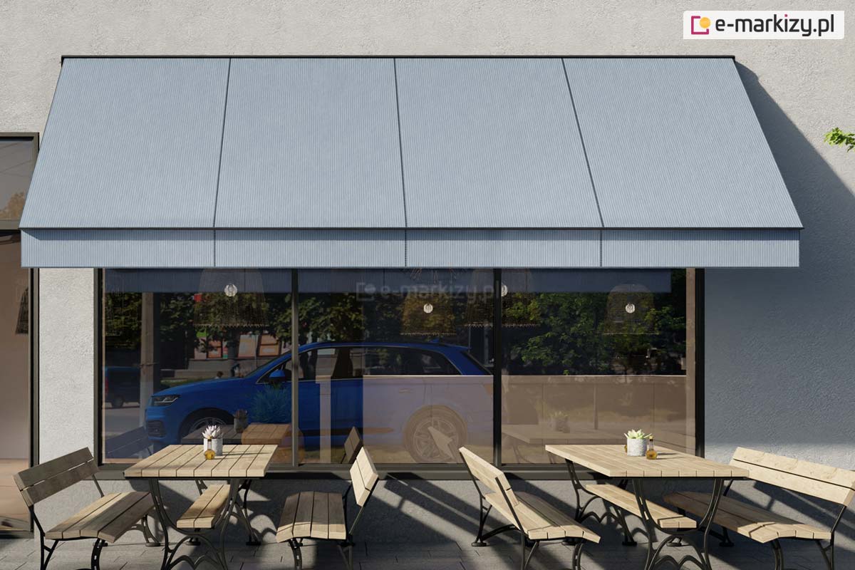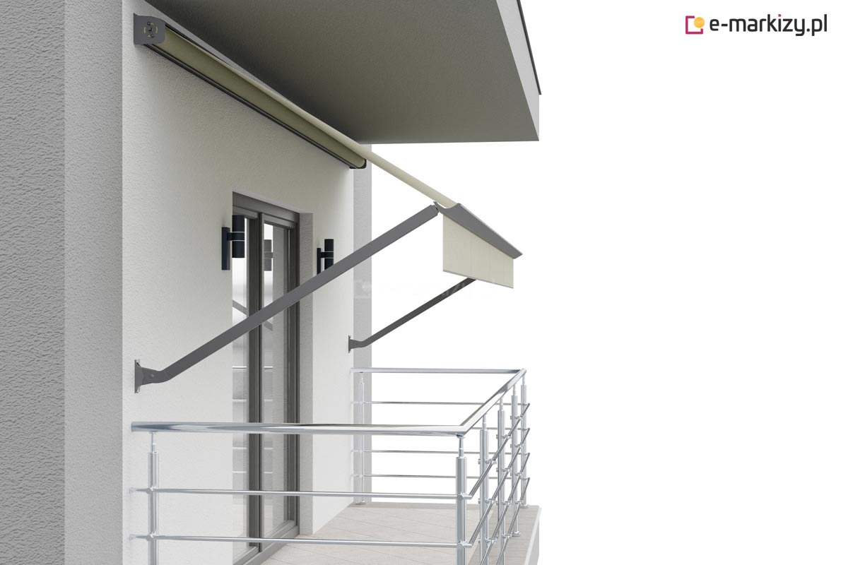 Markiza jest mocowana na uchwytach ściennych zespolonych do uchwytów sufitowych. Markiza jest już w całości skręcona i wyregulowana. W razie potrzeby możemy również dowolnie ustawiać kąt pochyłu. Ramiona markizy standardowo mocowane są do ściany lub opcjonalnie na wspornikach do boku wnęki.