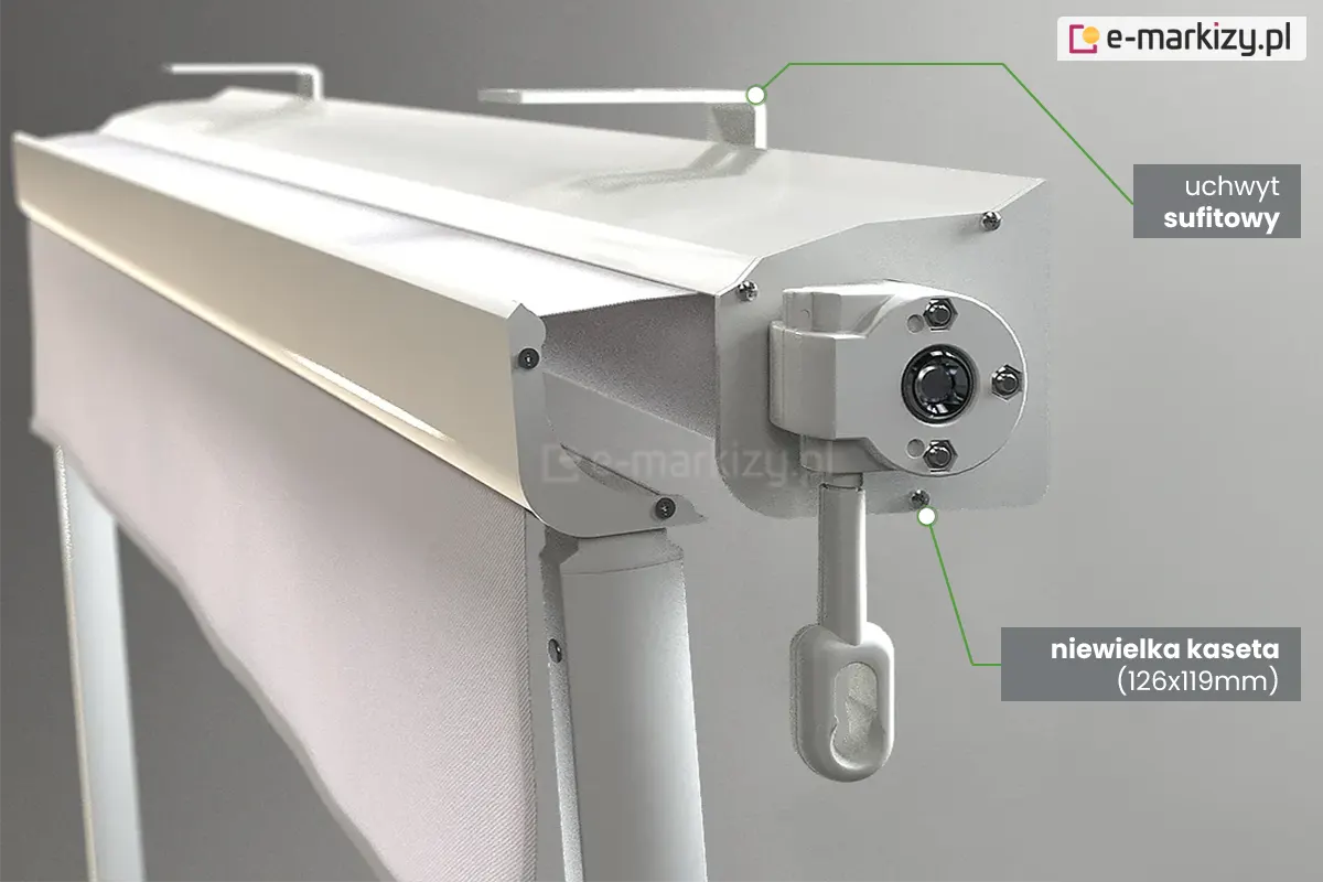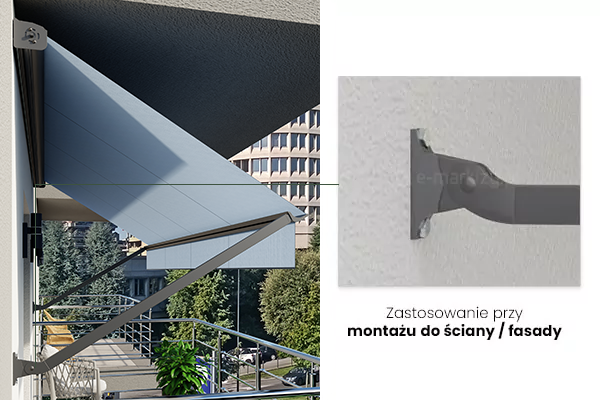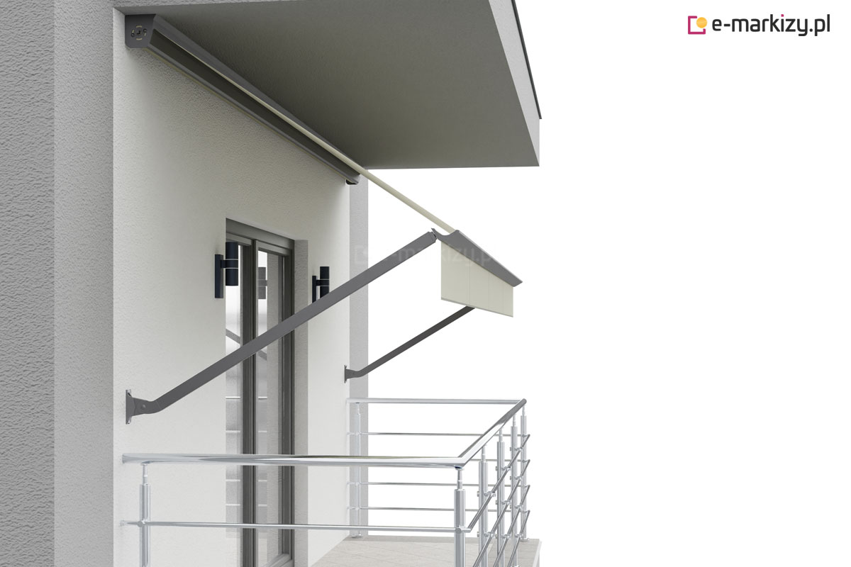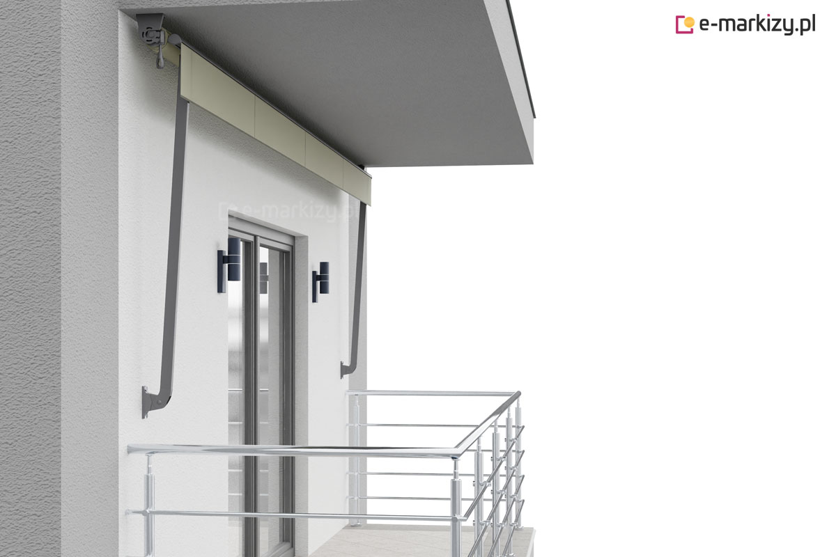 Konstrukcja markizy balkonowo-sklepowej charakteryzuje się uniwersalnymi uchwytami będącymi jednocześnie uchwytem ścienno-sufitowym