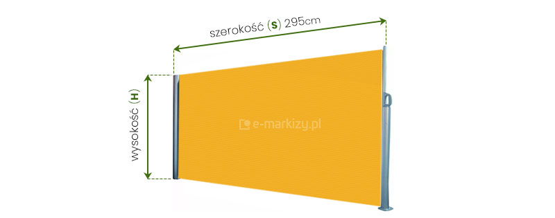 S – szerokość markizy, maksymalny stopień rozwinięcia tkaniny to 295cm.