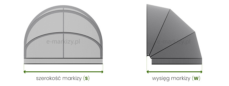 Markiza Koszowa produkowana jest na wymiar. Jeżeli chodzi o szerokość to nie ma standardowych rozmiarów. Maksymalna szerokość to 350cm a wysięg od 60cm do 140cm. Do zamówienia lub wyceny podajemy zawsze całkowitą zewnętrzną szerokość markizy, łącznie z uchwytami. W markizach półokrągłych wysięg to zawsze połowa szerokości. Wysięg to inaczej stopień rozwinięcia markizy.