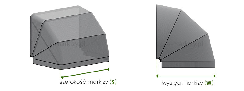 Markiza koszowa posiada dwa główne wymiary na podstawie których robiona jest wycena. Pierwszy to całkowita szerokość markizy, a drugi wysięg markizy (wysuw). Wymagane wymiary podawane są w cm., norma produkcyjna przewiduje tolerancję wymiarów szerokości -+2cm. W zależności od szerokości całej konstrukcji, producent przewiduje inną ilość uchwytów mocujących. Wysokość konstrukcji zależna jest od wybranego modelu i nie wpływa ona na cenę. Instrukcja pomiaru markizy koszowej przedstawiona jest na obrazku obok.