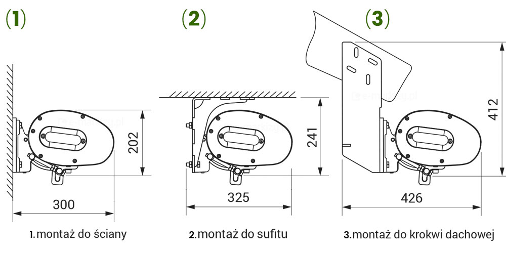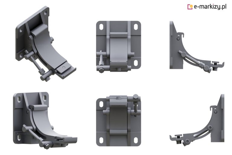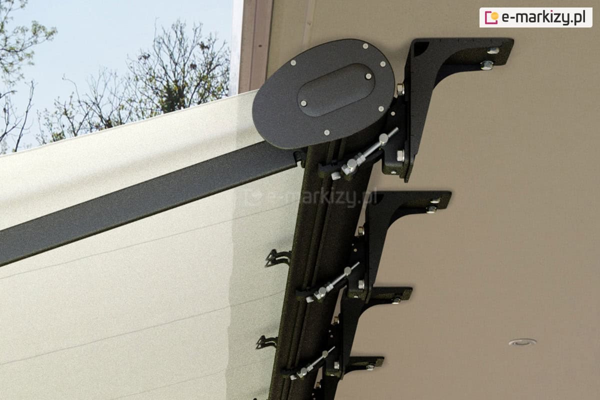 Markiza standardowo posiada uchwyty do ściany (1). Za dopłatą możemy dokupić uchwyty do sufitu (2) lub krokwi dachowej (3). Montaż markizy w zasadzie jest bardzo prosty i ogranicza się właściwie do zamocowania uchwytów na ścianie. Markiza jest już w całości skręcona i wyregulowana. W razie potrzeby możemy również dowolnie ustawiać kąt pochyłu.