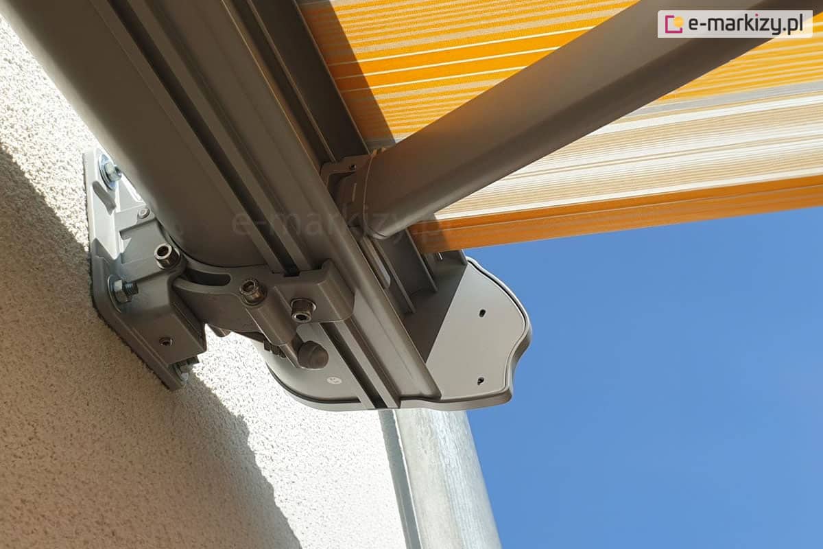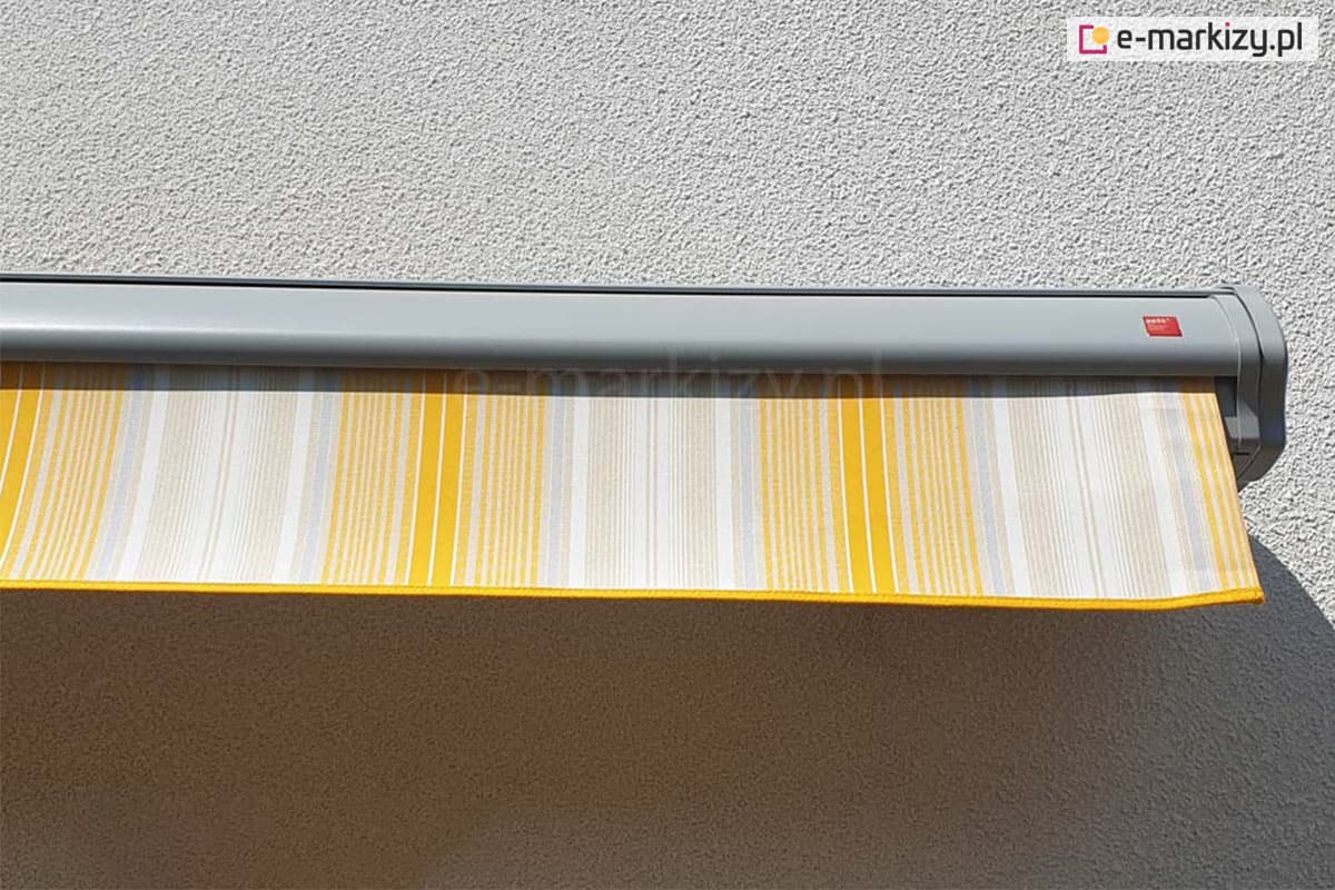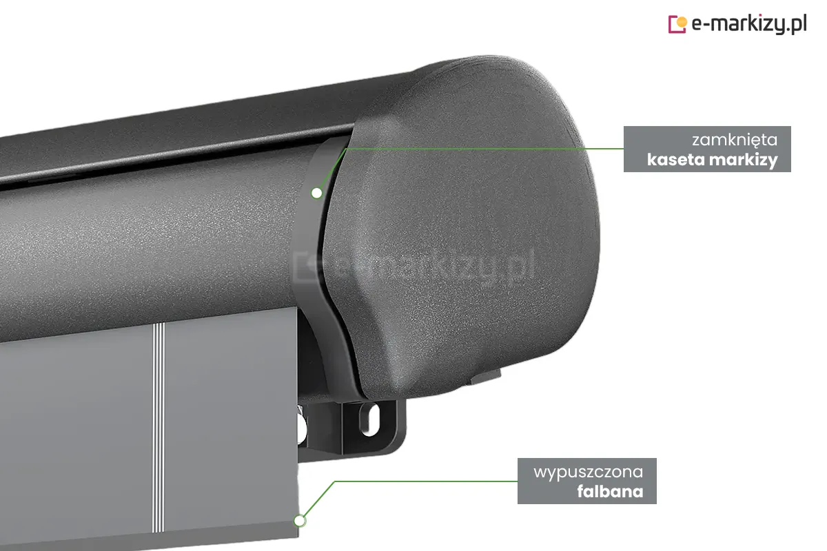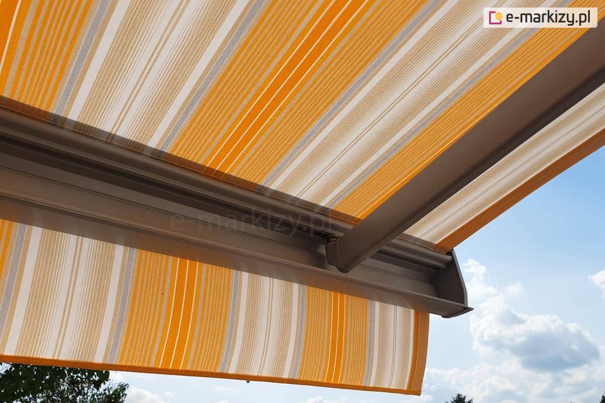 Markiza tarasowa Dakar w pełnej kasecie, doskonała do zaciemnienia większych tarasów. Markiza w kasecie, nowoczesny wygląd, osłona tkaniny i ramion przed czynnikami atmosferycznymi. Uszczelki zabezpieczające w kasecie. Rozkładane aluminiowe ramiona z łańcuchem Flyera, zamocowane na konsolowych uchwytach. Do wyboru 5 popularnych kolorów konstrukcji, w tym Antracyt. Duży wybór tkanin. Markiza Dakar w kasecie, produkcji firmy Selt z Opola