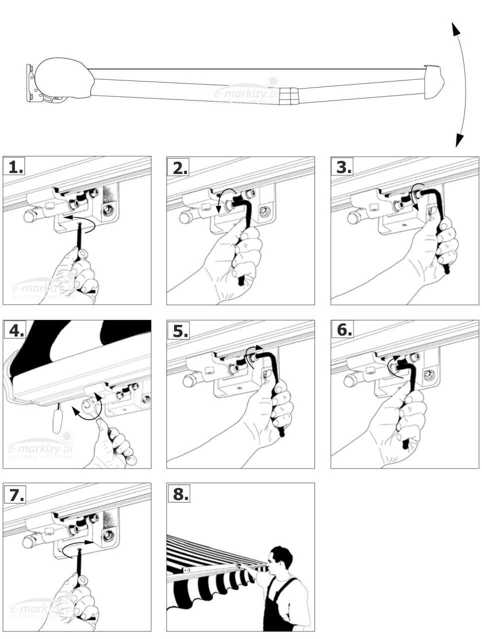 – Rozwinąć całkowicie markizę, odnaleźć uchwyt ramion ze śrubą regulacyjną