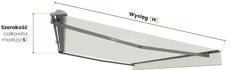 Markiza Tremolo produkowana jest na wymiar. Jeżeli chodzi o szerokość to nie ma standardowych rozmiarów. Maksymalna szerokość to 720cm a wysięg to 350cm. Do zamówienia lub wyceny podajemy zawsze całkowitą zewnętrzną szerokość markizy, łącznie z uchwytami. Wysięg to inaczej stopień rozwinięcia markizy.