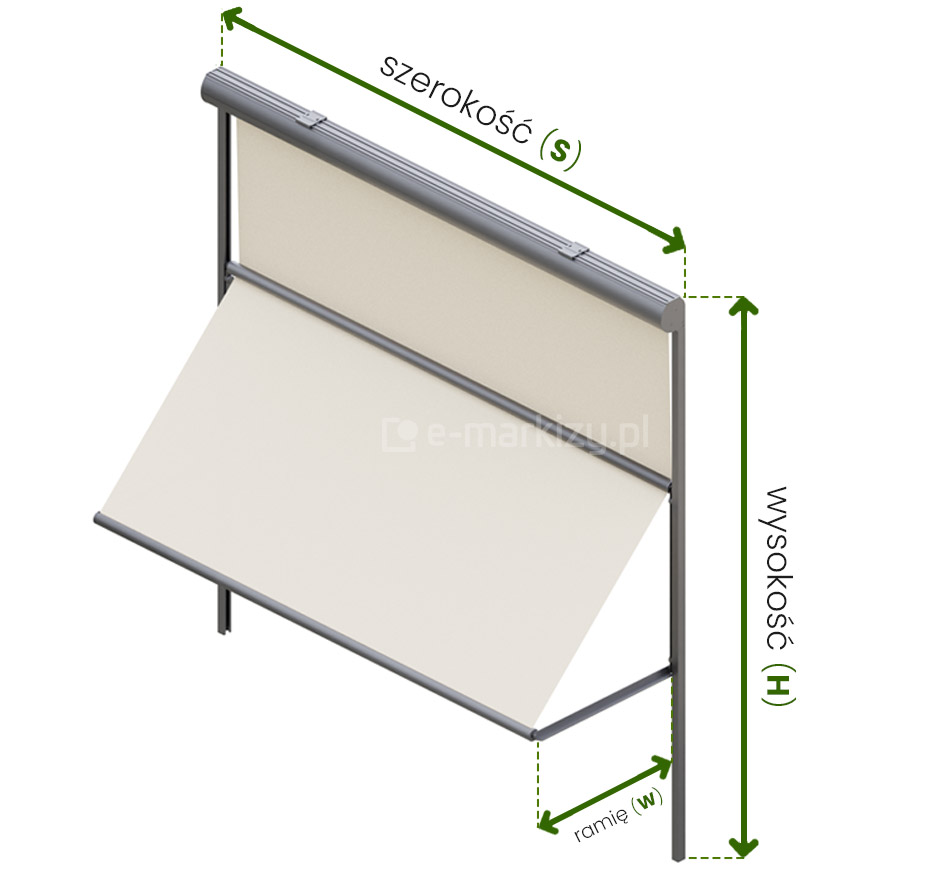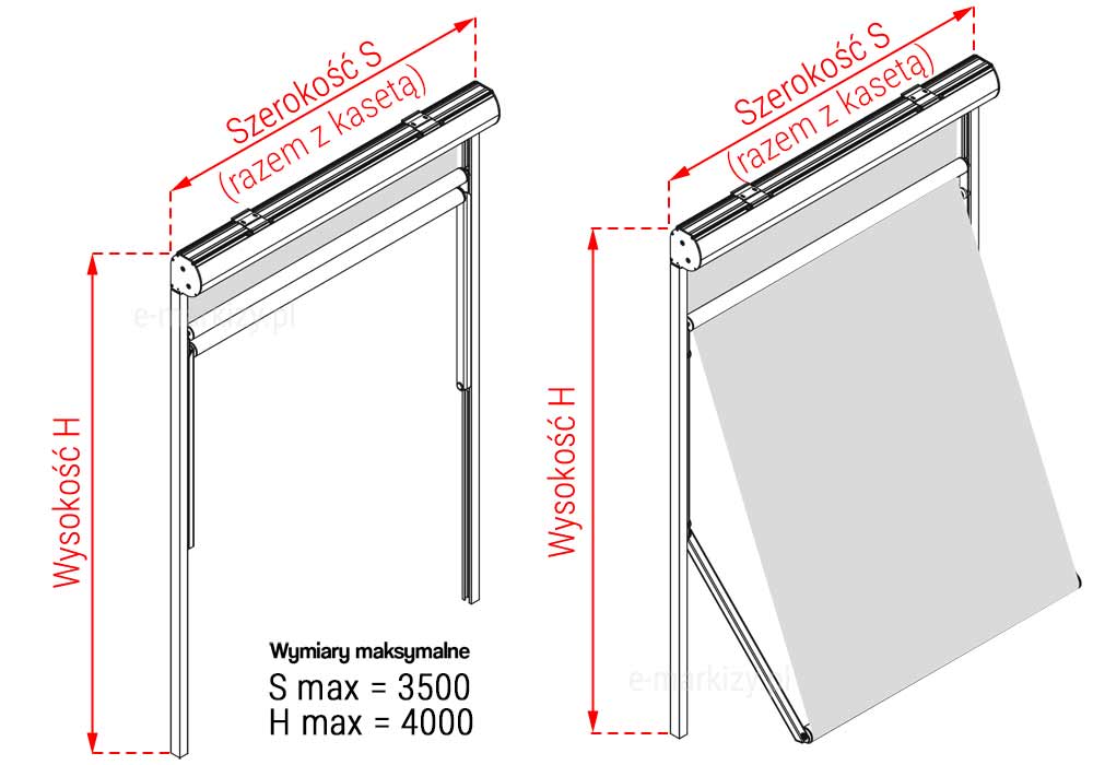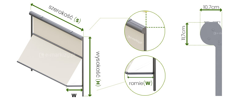 Wysokość H – jest to zewnętrzna skrajna wysokość całej markizolety – czyli prowadnic łącznie z kasetą (wymiary kaset i inne dane można znaleźć w zakładce dane techniczne)