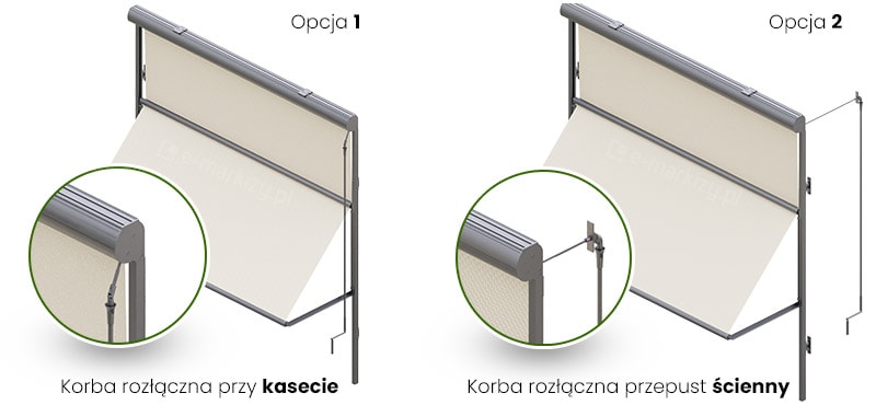 Markizoroletami sterujemy ręcznie lub elektrycznie. Napęd korbowy sterowany jest z zewnątrz lub wewnątrz pomieszczenia. W przypadku napędu elektrycznego, przewód wyprowadzony jest na długość ok. 2mb i umiejscowiony mniej więcej na środku systemu. Można go podłączyć dowolnie z prawej lub z lewej strony rolety.