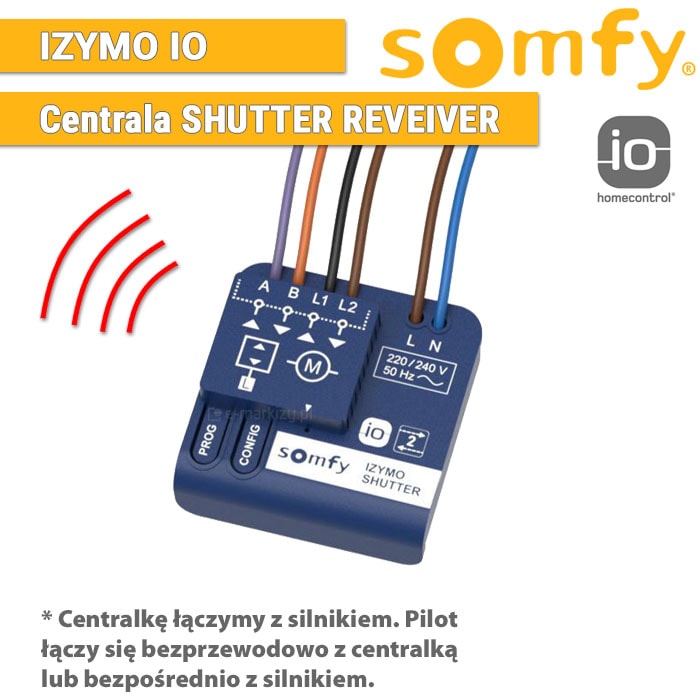 Odbiornik IZYMO io umożliwi Ci przekształcenie przewodowego napędu w roletę sterowaną za pomocą pilota lub bezprzewodowego nadajnika Smoove. Dzięki dodaniu go do swojego systemu TaHoma, będziesz mógł zarządzać nim zdalnie przez internet z każdego miejsca na ziemi.