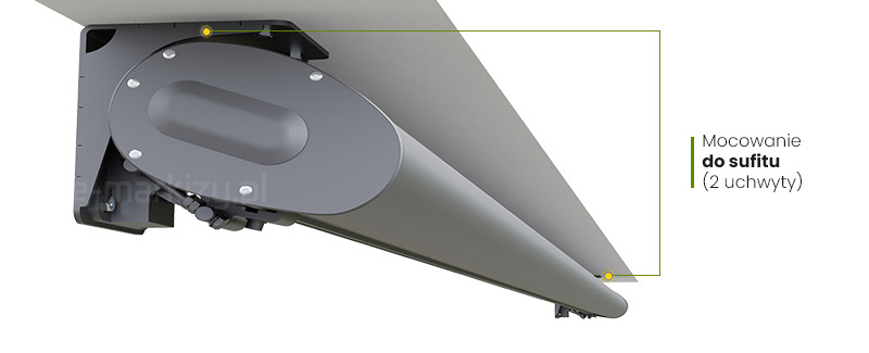 W standardzie występuje uchwyt ścienny. Jeśli markizę chcemy zamocować do sufitu, należy dokupić wspornik sufitowy 2, który skręcamy ze standardowym uchwytem 1 co daje nam jedną całość.