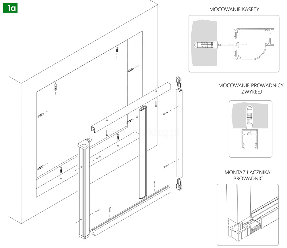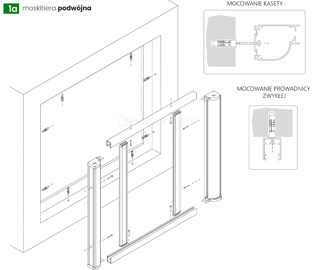 1a. Montaż moskitiery do wnęki. Prowadnica pojedyncza (nie dystansowa)