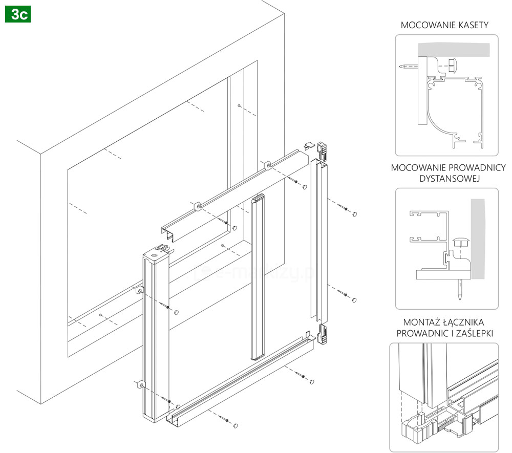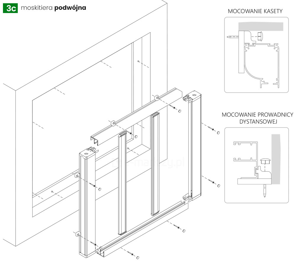 3c. Montaż moskitiery do wnęki, ramy drzwi lub ściany. Prowadnica dystansowa z kostkami montażowymi