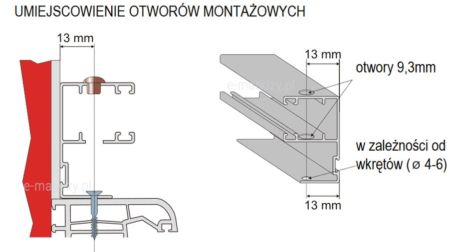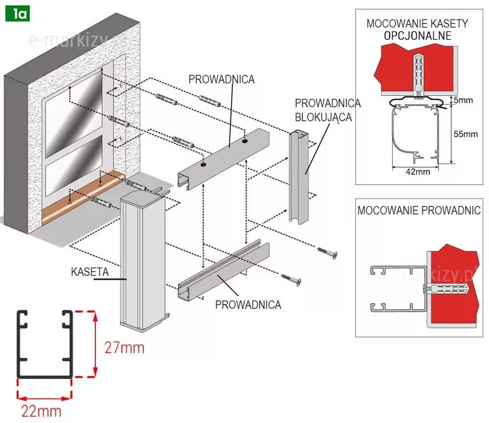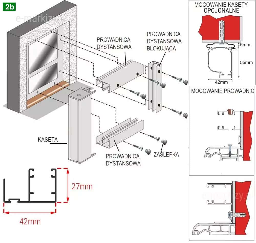 Standardowo kaseta jest mocowana do prowadnic (na wczepy) i nie ma potrzeby jej osobnego zamocowania (przykręcenia). W razie potrzeby kasetę możemy zamocować za pomocą klipów montażowych, które mają wysokość około 5mm. Prowadnice o wymiarach 27x22mm montowane bezpośrednio do wnęki.