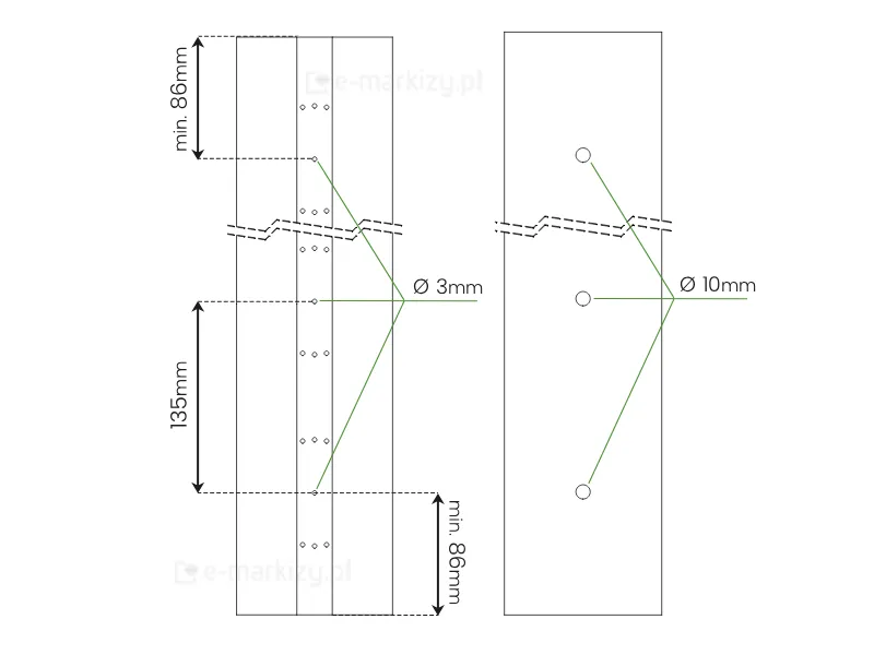 Wstępne nawiercanie otworów w słupach: Wykonaj wstępne otwory w słupach wiertłem Ø3 mm. W przypadku lameli obracanych korzystaj wyłącznie ze środkowych otworów w szablonie.