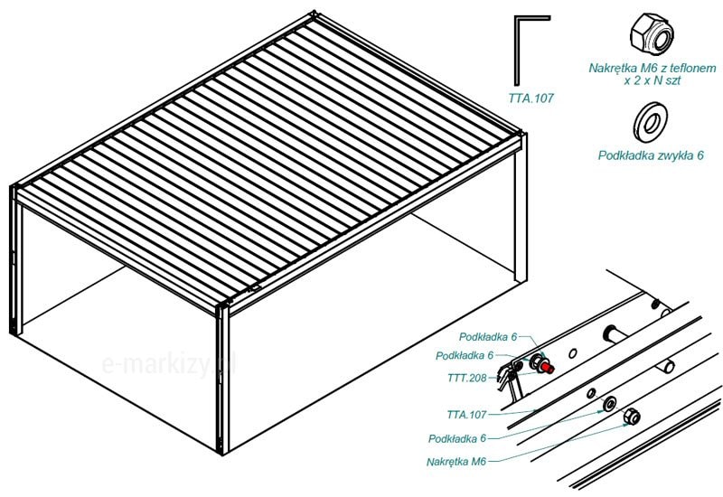 16. Zamontować profil spinający lamele tta.107, za pomocą trzpieni lameli.