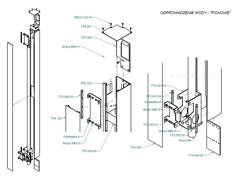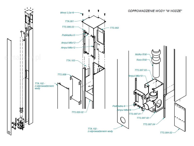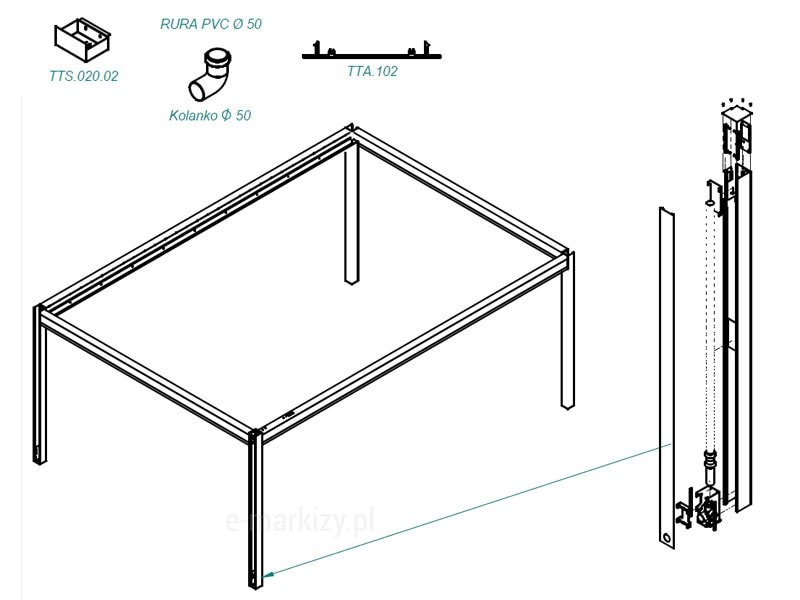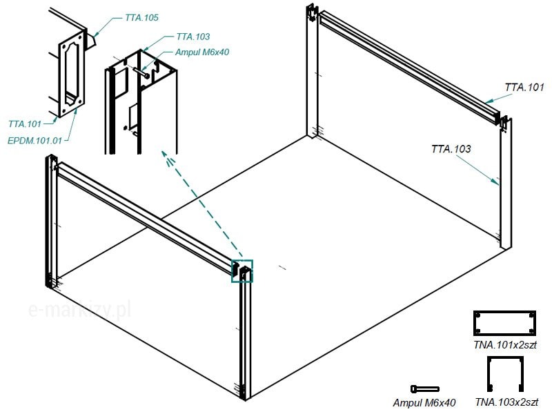 Uwaga! W przypadku odprowadzenia wody w nodze, przed zamontowaniem prowadnic tta.101 do profili tta.103, należy zamontować wypełnienie tts.020.02 w profilu tta.103