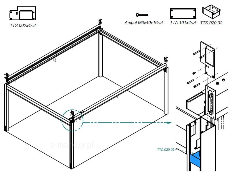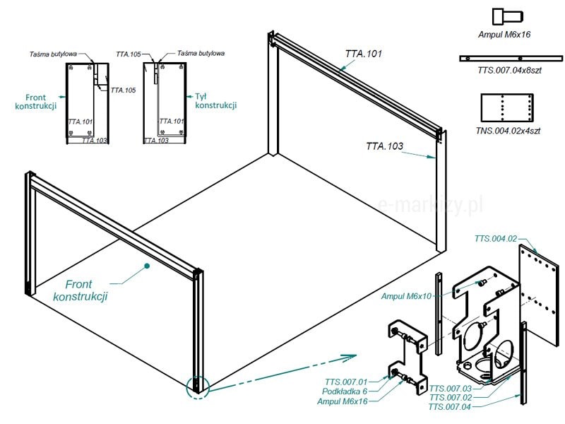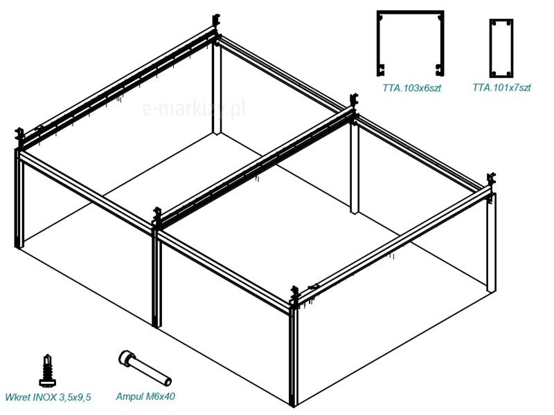 8. Zakotwiczyć profile tta.103 z profilami tta101 za pomoca dwóch śrub, od wewnętrznej strony konstrukcji, ampuł m6x40.