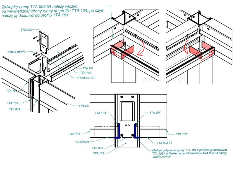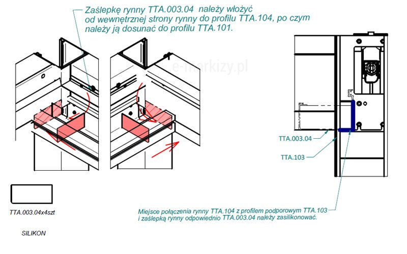 Miejsce połączenia rynny TTA.104 z profilem podporowym TTA.103 i zaślepką rynny odpowiednio TTA.003.04 należy zasilikonować.