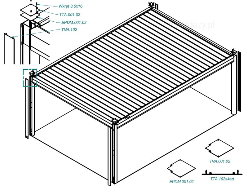 Miejsce połączenia rynny TTA.104 z profilem podporowym TTA.103 i zaślepkę rynny odpowiednio TNA.003.04 należy zasilikonować