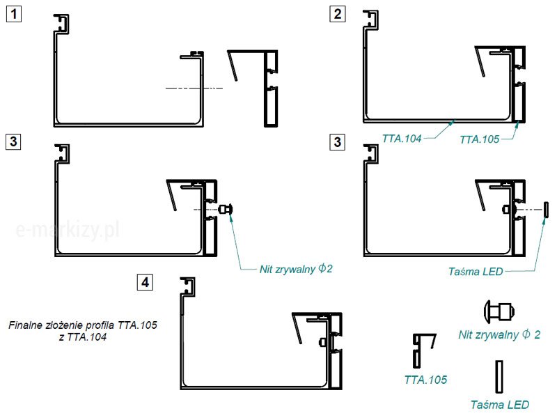 2. W celu montażu pozostałych profili, należy postępować zgodnie z dalszą częścią