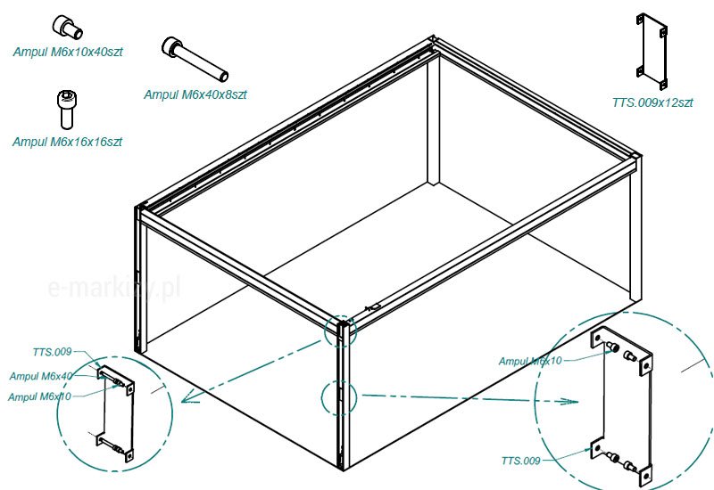 9. Powstałą bramkę należy zakotwiczyć na kostkach nóg tta.007.03 i tta.007.02, używając śrub Ampuł m6x10.