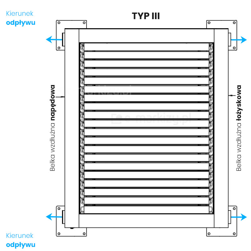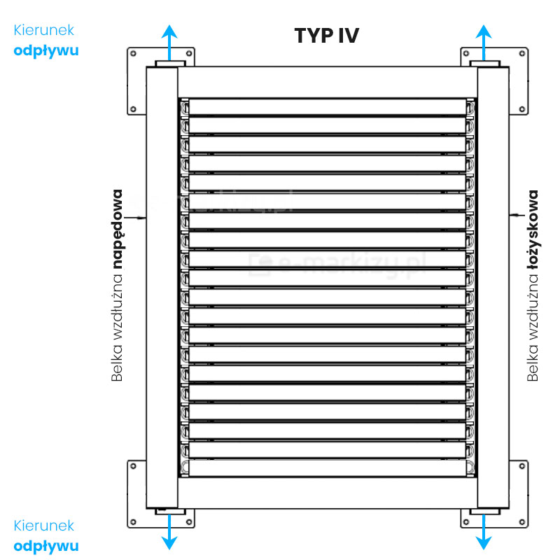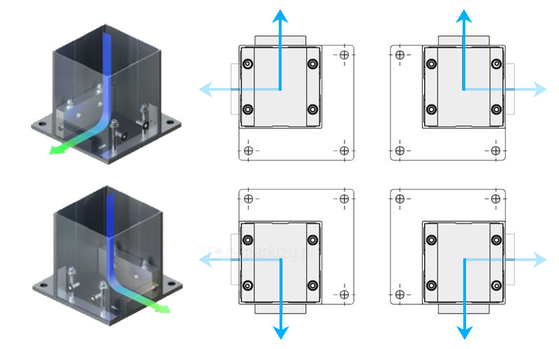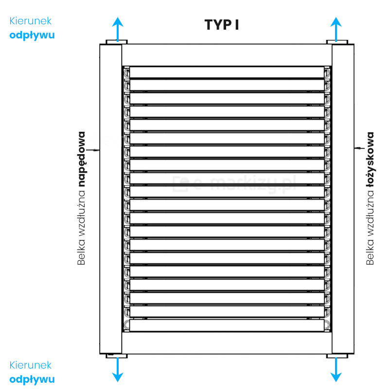 Odprowadzanie wody deszczowej z pergoli dostosowane jest do różnych sposobów montażu, a kierunek odpływu jest uzależniony od typu montażu zadaszenia oraz ułożenia podpór pergoli. Poniżej znajdziesz schematy z widokiem z góry, ilustrujące różne konfiguracje marek montażowych (czyli stóp pergoli). To zależność od sposobu montażu pergoli oraz ułożenia podpór, decyduje o tym, z której strony woda będzie odprowadzana.