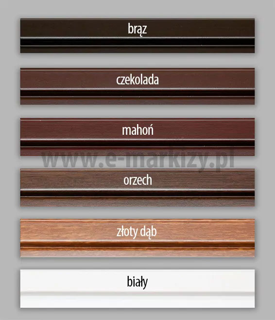 Siatka moskitiery występuje w odcieniach szarym lub czarnym. Standardowo pozostałe elementy konstrukcji osłony przeciwko komarom mogą być wykonane w klasycznej bieli lub brązie, które dobrze komponują się ze standardowymi ramami okna. Popularnym wyborem są drewnopodobne kolory konstrukcji z widoczną fakturą drewna, w takich odcieniach jak np. złoty dąb lub orzech. Łączniki narożnikowe zawsze wykonane są z pcv i dobierane są w kolorystyce jak najbardziej zbliżonej do wybranego koloru ramy moskitiery.