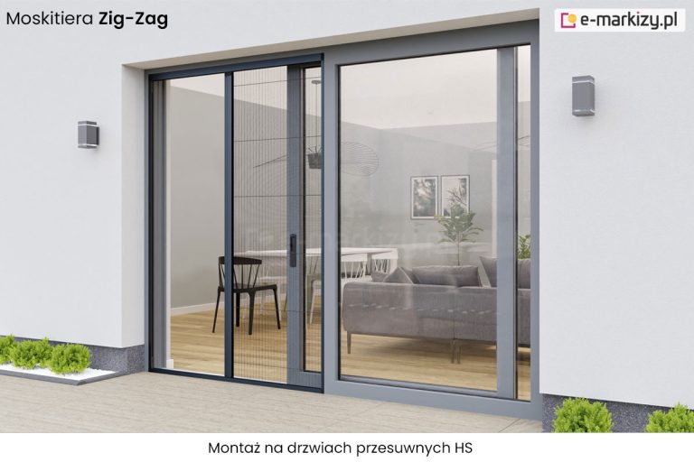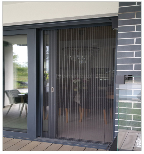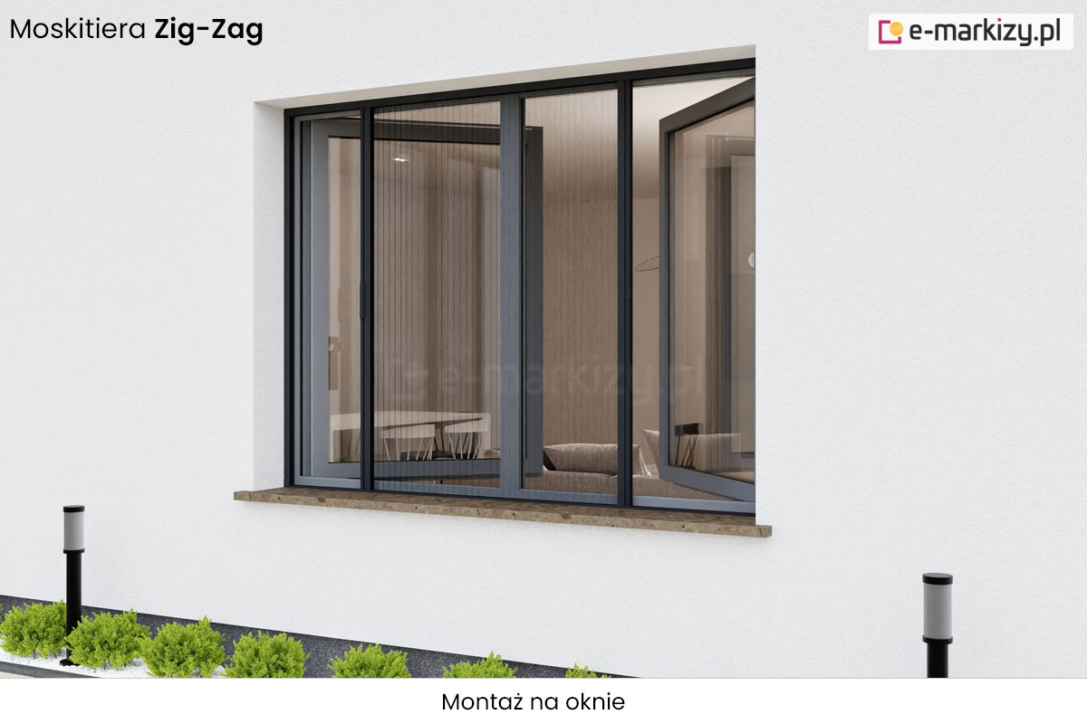 Moskitiera Zig-Zag – Możliwość przesłonięcia wnęk o szerokości 3m. Moskitiera plisowana drzwiowa Zig-Zag posiada możliwość otwierania i zatrzymania obu skrzydeł w dowolnej pozycji. Moskitiera nie ogranicza funkcjonalności drzwi, nieduża klamka ułatwia jej rozwijanie, a niska prowadnica dolna nie utrudnia przechodzenia. Dedykowany montaż we wnęce okiennej.
