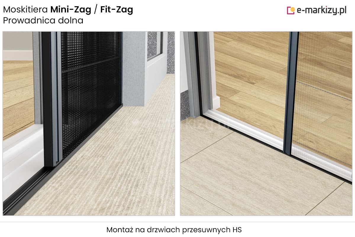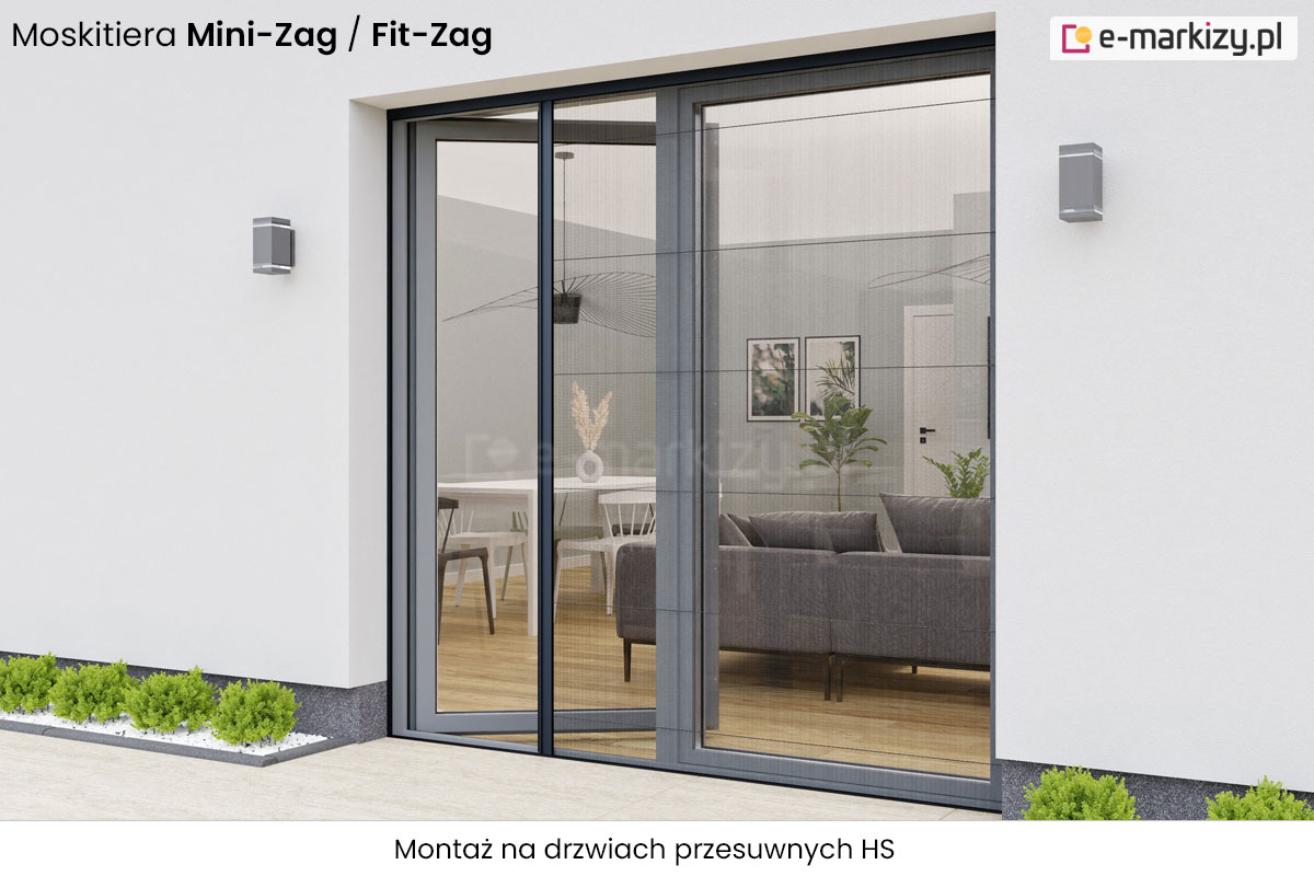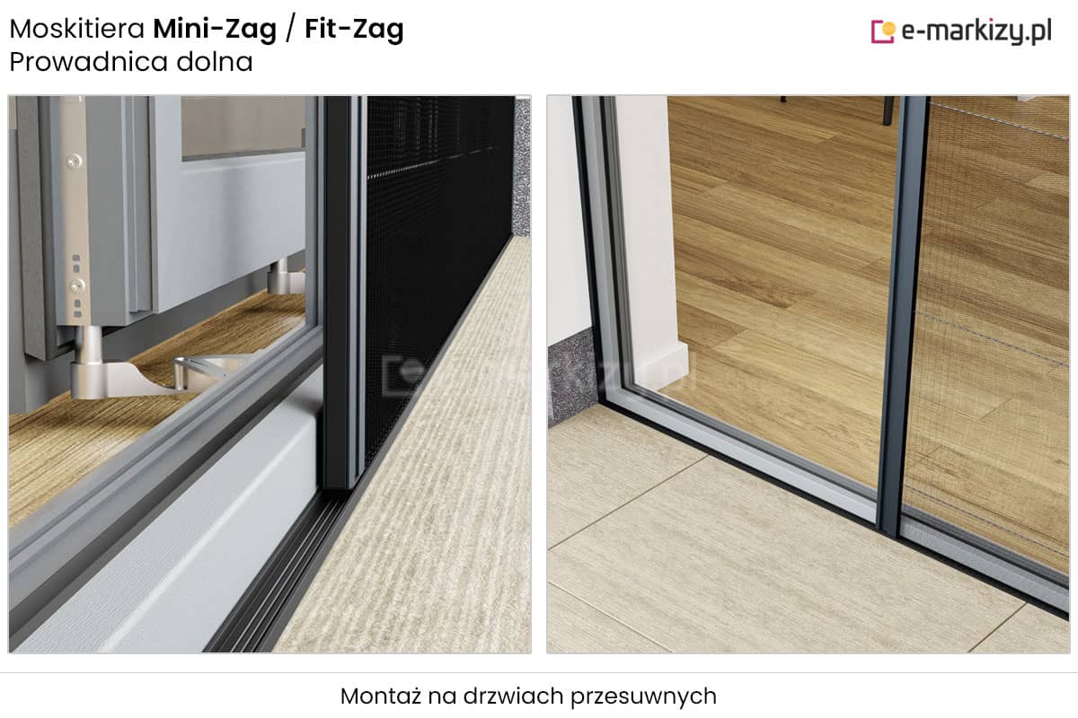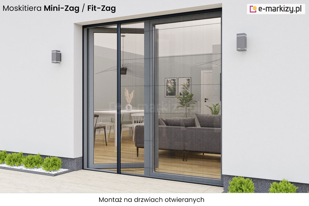 Moskitiera Plisowana Drzwiowa Fit-Zag posiada możliwość zamontowania w podwójnej prowadnicy rolety zewnętrznej oraz pomiędzy roletą zewnętrzną a oknem. Moskitiera otwierana jest jednostronnie (możliwość zatrzymania w dowolnej pozycji).