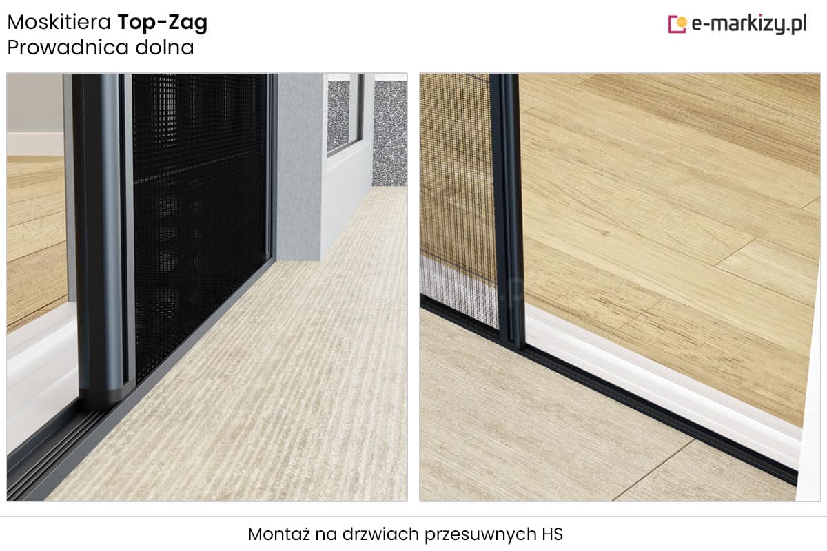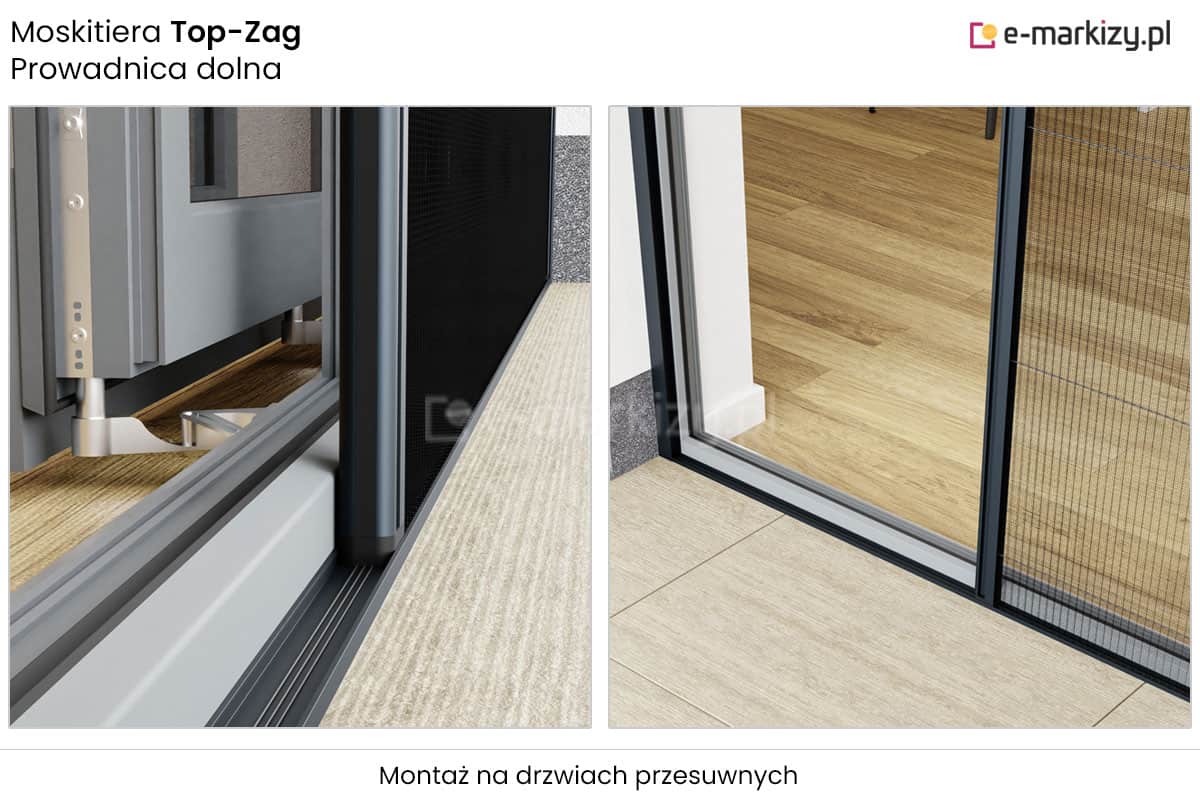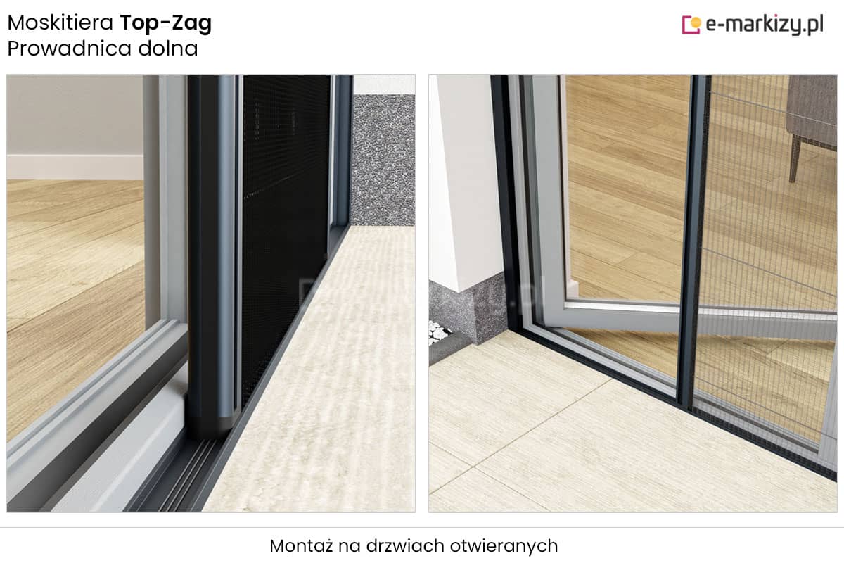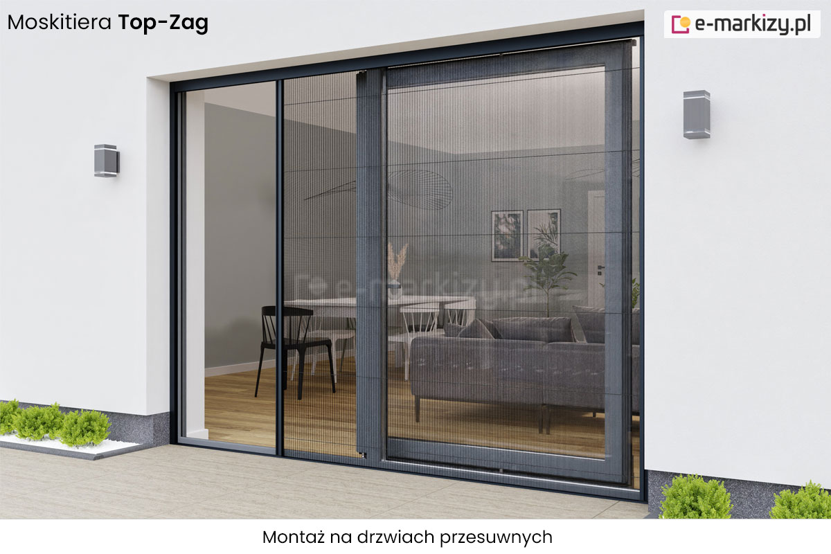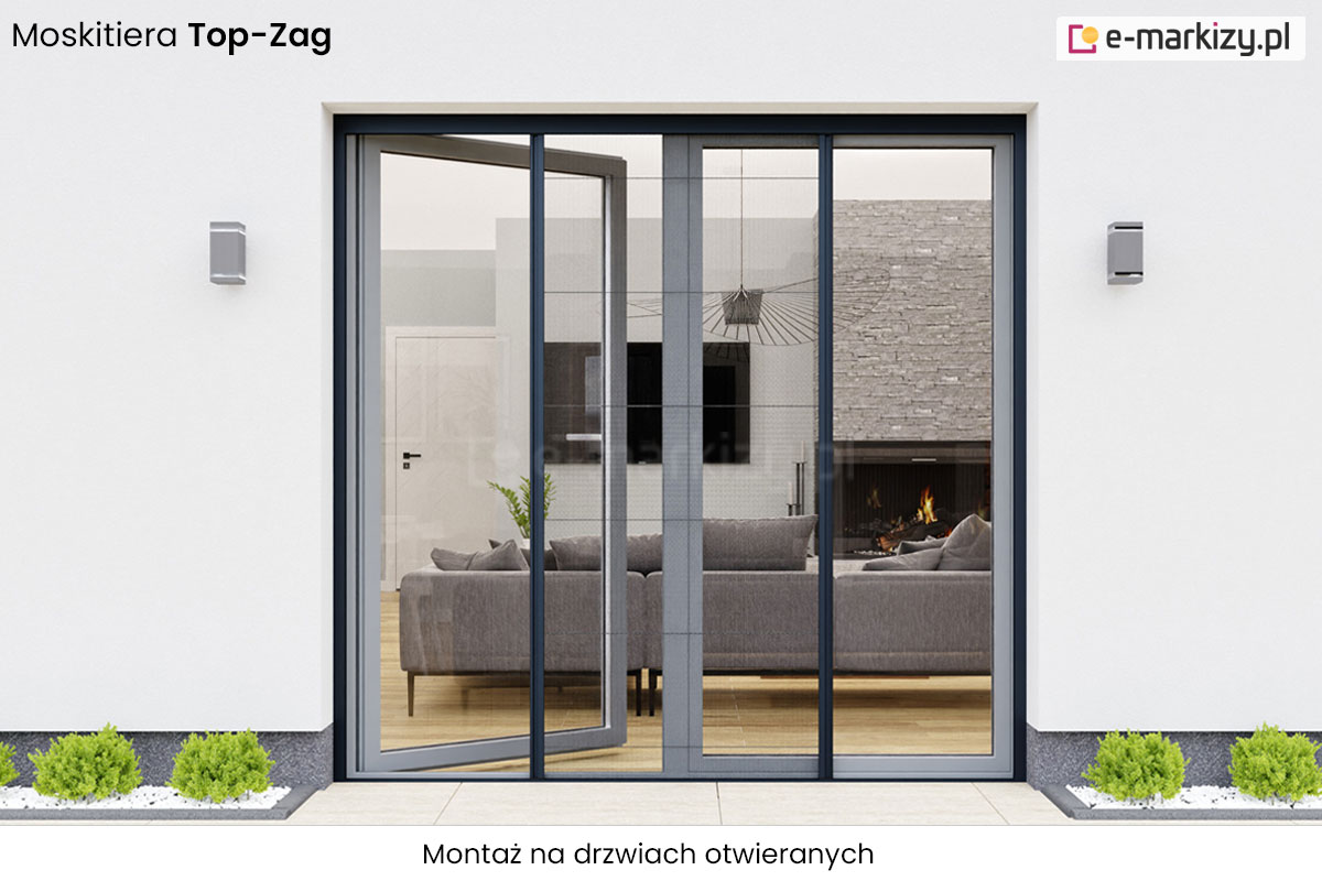 Drzwiowa-plisowana moskitiera Top-Zag posiada magnetyczne domykanie. Duże maksymalne wymiary pozwalają na przysłonięcie dużych wnęk, nawet do 800cm. Siatka moskitiery występuje w kolorach białym i czarnym. Moskitiera przeznaczona jest do montażu na wnęce lub we wnęce. System Top-Zag posiada możliwość montażu bez słupka na oknie narożnikowym. Moskitiera nie ogranicza funkcjonalności drzwi, profil przesuwny z zagłębieniem zastępującym klamkę.
