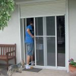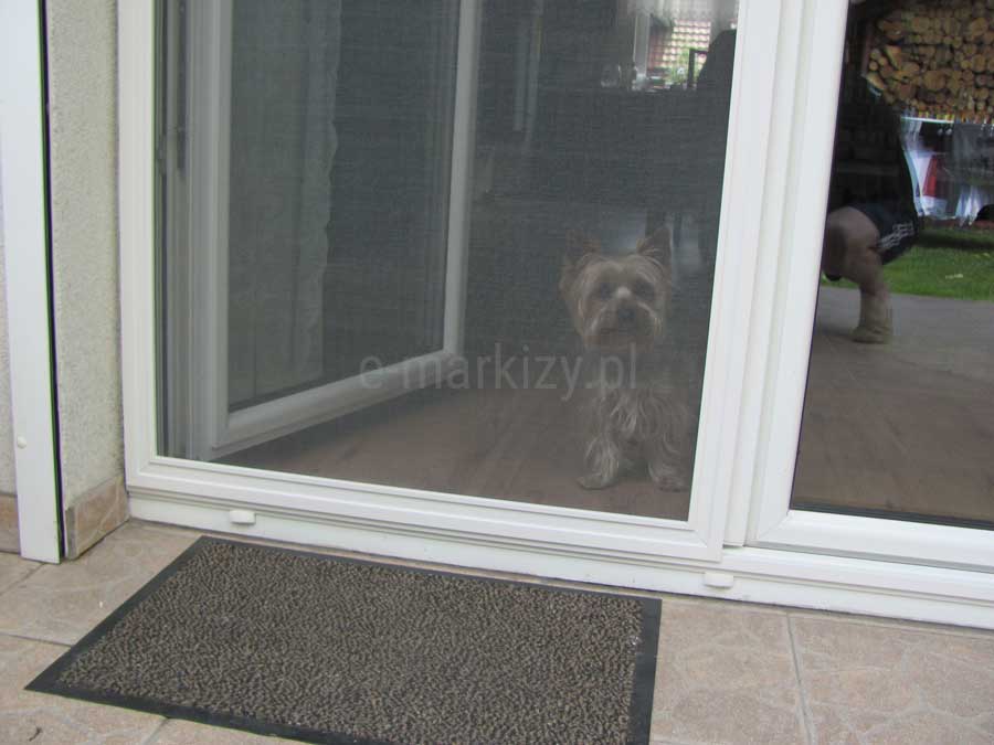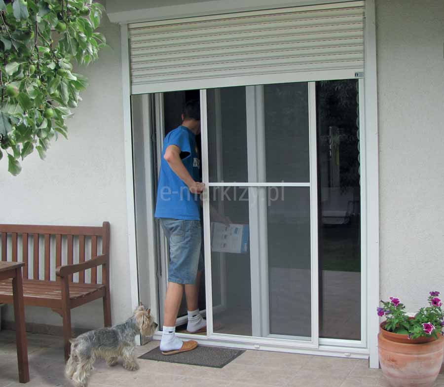 Moskitiera Slim – Bardzo wąski panel przesuwny posiada uszczelkę szczotkową na całym obwodzie drzwi. Bardzo lekkie przesuwanie, dzięki zamocowanym rolkom w panelu moskitiery. Profil moskitiery łączony zaciskanym narożnikiem wewnętrznym pod kątem 45 stopni. Moskitiera posiada dodatkową poprzeczkę (szpros). Możliwość montażu pomiędzy roletą, a drzwiami.