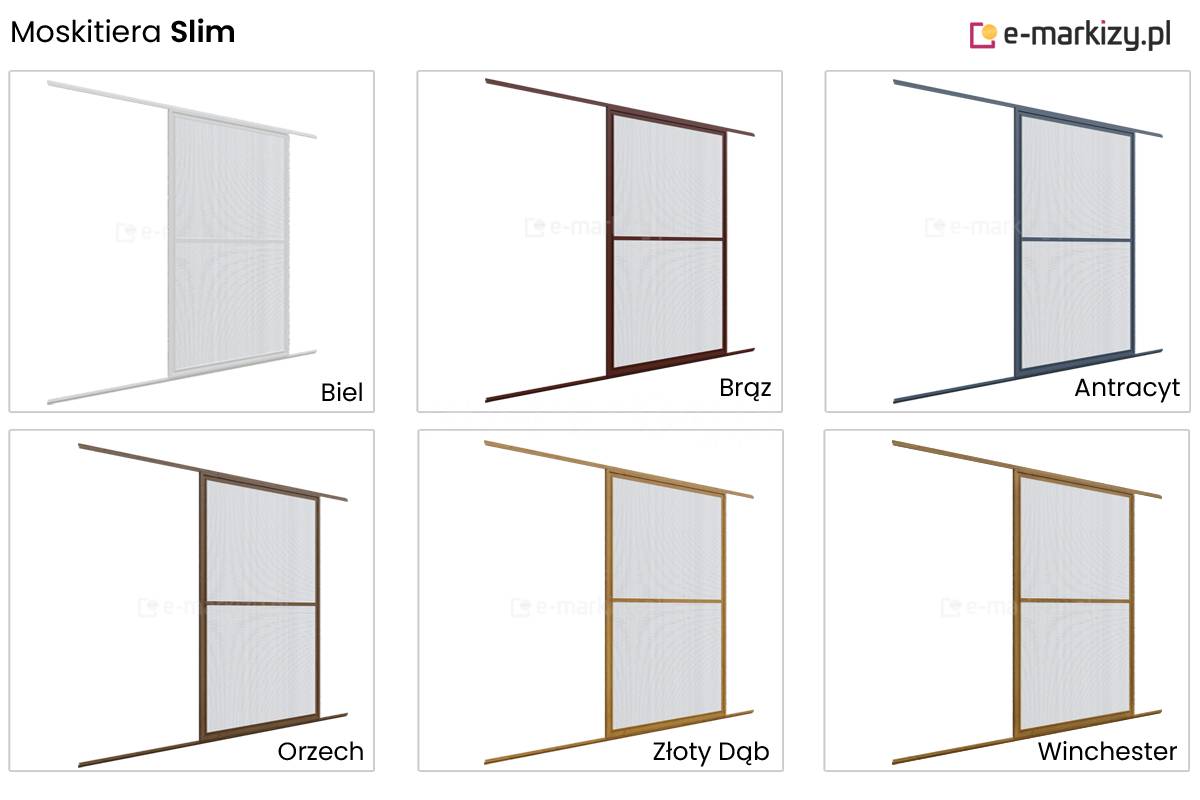 Standardowo moskitiera Slim wyposażona jest siatkę w kolorze szarym. Za dopłatą dostępne są inne rodzaje siatek, o innym odcieniu, samoczyszczące, antybakteryjne oraz o wzmocnionej sztywności.